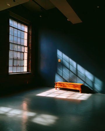 Sunlight creates dramatic patterns on the wall and floor of an empty room.