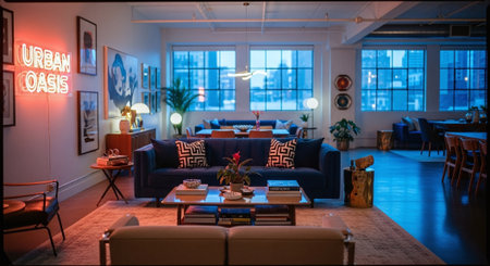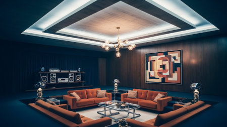 A luxurious interior featuring bold art pieces, elegant furniture, and dramatic lighting, creating a refined and cozy atmosphere.