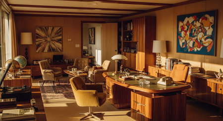 An AI generated illustration of This is a well-lit conference room featuring wooden walls and desks set up in an organized fashion