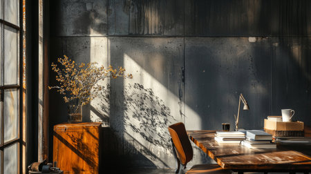 Bedroom decor, home interior design . Industrial Mid-Century Modern style with Bookshelf decorated with Concrete and Wood material . Generative AI AIG26.