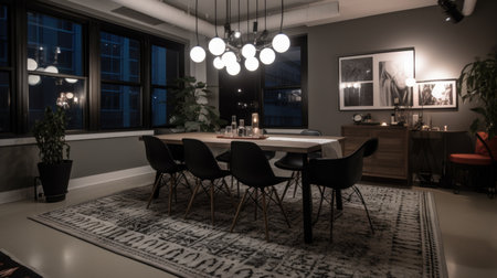 Interior design of Dining Room in Modern style with Statement chandelier decorated with Leather dining chairs, patterned rug material. Industrial architecture. Generative AI AIG24.