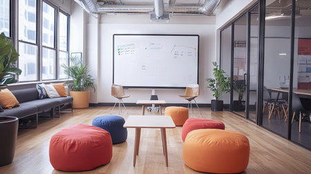 A startup-style meeting room with a large brainstorming whiteboard, bean bags, and a casual work environment.