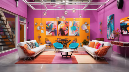 A vibrant modern workspace featuring colorful murals, stylish furniture, and an inviting atmosphere ideal for creativity and collaboration. Perfect for team meetings.