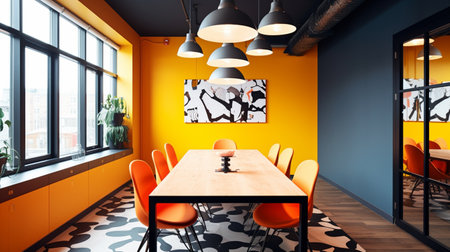 The image showcases a modern office space, featuring a colorful design with contemporary furniture and decor, perfect for advertising or editorial content.