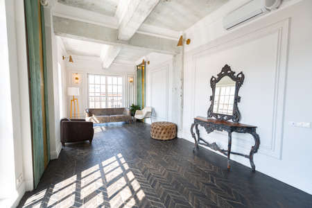 Chic, luxurious guest room design with old-fashioned antique furniture. white walls are decorated with relief. there is a beautiful dark brown parquet on the floor.
