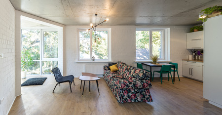 Relaxation and dining space in bright modern studio apartment