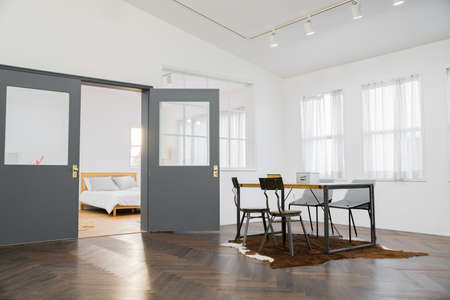 Table with chairs located near lounge area and dining in spacious room of contemporary apartment