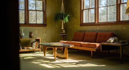 A stylish mid-century modern living room featuring orange and green decor, large windows with a view of autumn trees, and contemporary furniture