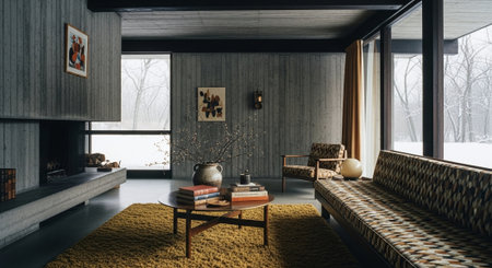 A cozy mid-century modern living room with a stone fireplace, large windows showing a snowy landscape, and stylish furniture including a patterned sofa and coffee table