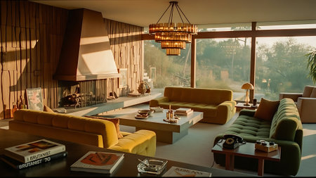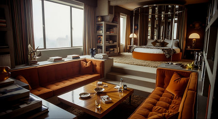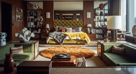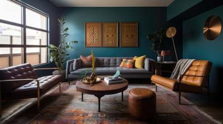 Interior design of Living Room in Mid-century modern style with Wall art decorated with Leather, wood, brass, ceramic material. Loft architecture. Generative AI AIG24.