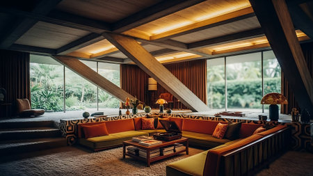 Interior design of Living Room in Mid-Century Modern style with Large fireplace decorated with Patterned rug, leather chair material. Mid-century modern architecture. Generative AI AIG24.