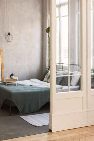 Loft Style Bedroom white Interior Design . Vertical image