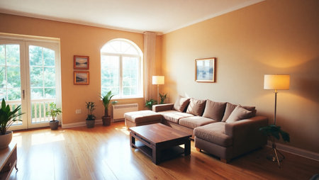 Cozy living room with sofa, coffee table and window in morning sunlight