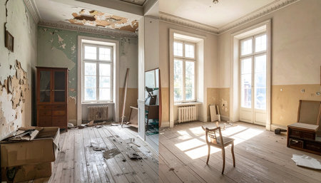 This image highlights a transformative renovation concept, presenting a striking before-and-after comparison of an apartment's restoration or refurbishment with modern design elements, enhanced