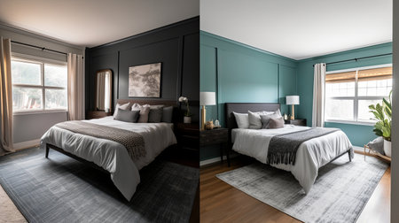 Before and after photos showcasing a bedroom renovation with two distinct color palettes. The bedroom features new furniture, stylish decor, and fresh paint.