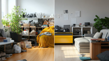 One side reveals a disordered area filled with clutter, while the opposite shows a neat, serene space emphasizing calm and order.