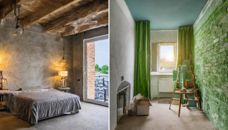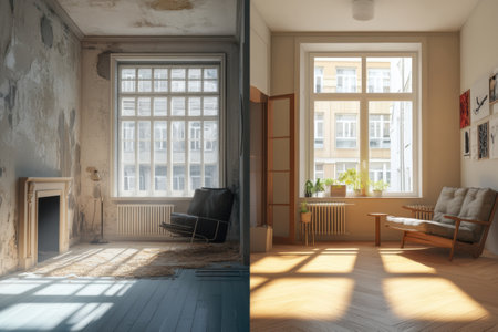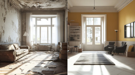 Experience the dramatic transformation of an apartment through a stunning renovation concept. This visual contrasts the before and after states, featuring expert restoration, modern