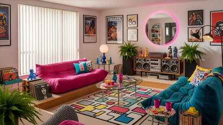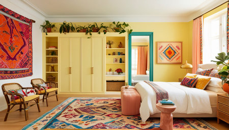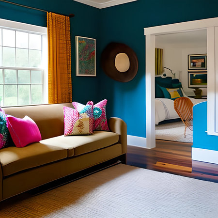 Eclectic living room with vibrant colors and natural light