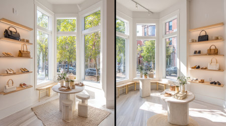 A beautifully designed boutique interior featuring stylish displays of shoes and handbags, illuminated by natural light, creates an inviting shopping atmosphere.