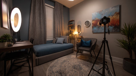 This cozy indoor space showcases a modern blend of comfort and aesthetics, perfect for decorating or photography with appealing lighting and stylish furnishings.