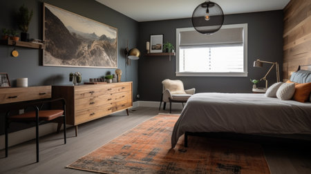 Bedroom decor, home interior design . Mid-Century Modern Industrial style with Accent Wall decorated with Wood and Metal material . Generative AI AIG26.