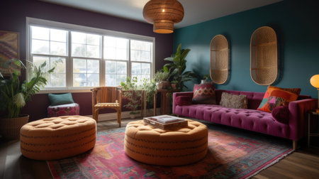 Interior design of Living Room in Bohemian style with Gallery Wall decorated with Woven Poufs, Macrame material. Contemporary architecture. Generative AI AIG24.