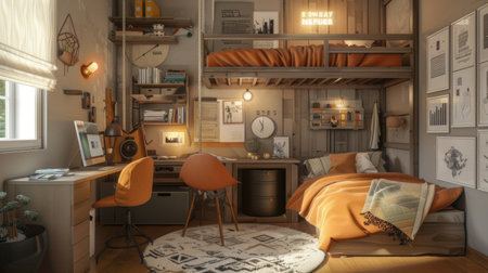 A teenager's bedroom with a loft bed, study area, and personal decor reflecting their hobbies and interests, providing a functional and personalized space.