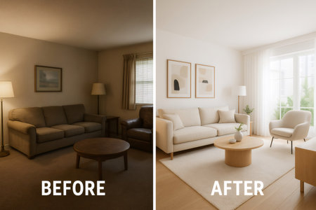 Before & After Concept. A diptych image showing the same living room from the exact same angle. On the left