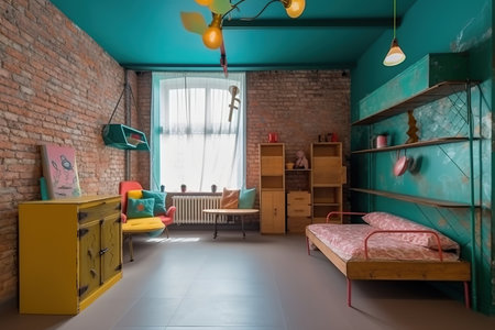 Retro loft children's room with brick walls, colorful furniture, and play area, AI generated