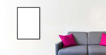 Empty picture frame on a white wall above a sofa. Minimalist interior background. Horizontal banner