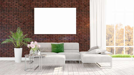 White living room interior with a white sofa and a framed poster. 3d rendering mock up