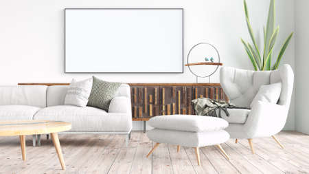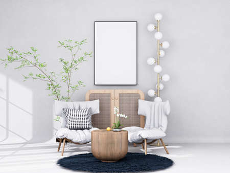 Mockup poster frame in Minimal style. interior with modern furniture. Minimalist interior design. living room frame design. copy space white background. modern white house concept. 3D illustration.