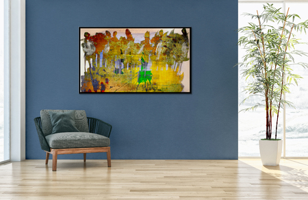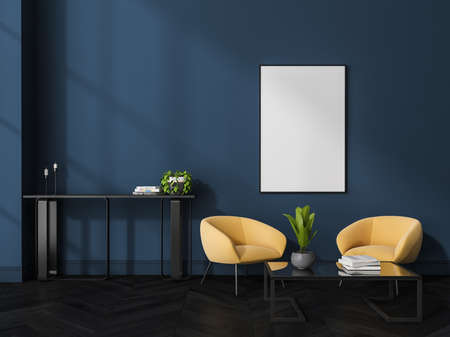Canvas on blue wall in living room interior with yellow armchairs in seating area, console table and black wooden floor. Concept of modern design. Mock up. 3d rendering