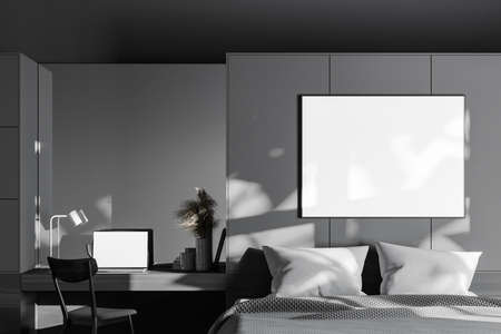 Interior of comfortable master bedroom with gray walls, cozy king size bed, mock up poster and home office with mock up laptop screen. 3d rendering