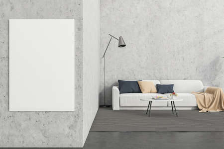 Living room interior with empty poster on wall, couch, coffee table, carpet and concrete floor. Concept of minimalist scandinavian design. Comfortable place for meeting. Mock up. 3d rendering