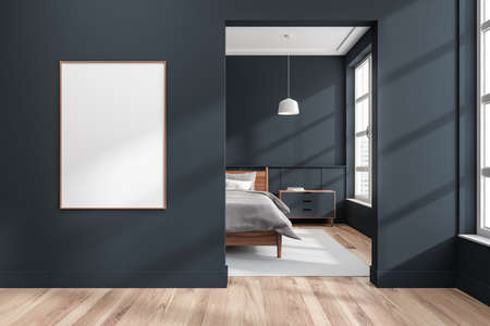 Mock up canvas in dark blue corridor with entrance to bedroom, having wood bed, white pendant lamp, bedside table and gray rug. Parquet floor. Concept of modern interior design. 3d rendering