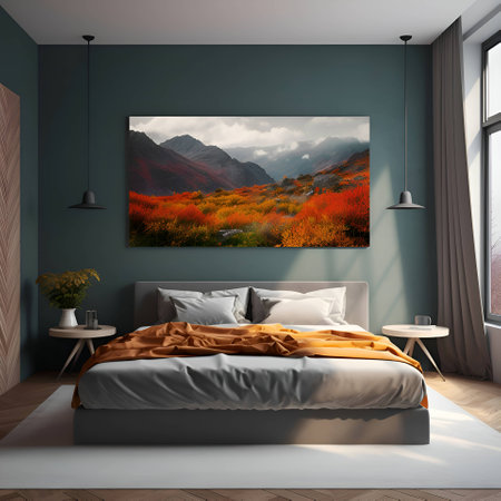 A modern bedroom with a large landscape painting on the wall. The painting depicts a mountain range in autumn with colorful foliage. The bedroom is decorated in a minimalist style with a gray bed, white pillows, and a warm-colored blanket.