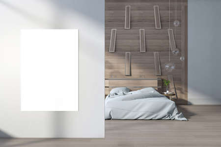 Modern bedroom interior with clean white mock up banner, bright daylight, wooden flooring, furniture and decorative objects. Style and design concept. 3D Rendering