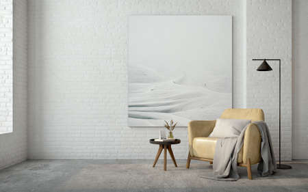 Minimal loft style interior.Armchair,side table,lamp and canvas on brick wall background.3d rendering