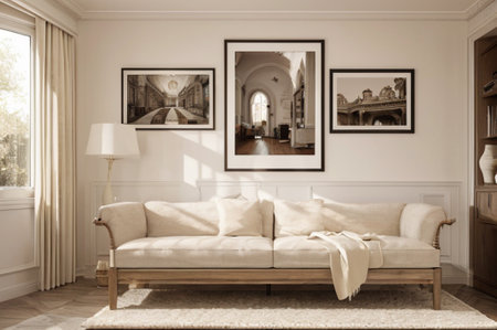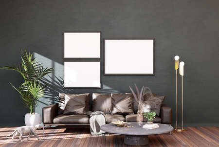 Living room interior with sofa, coffee table and picture frames on wall