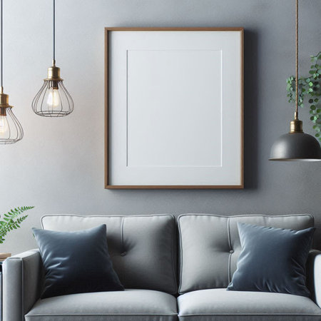 Interior of modern living room with gray sofa, pillows and picture frame