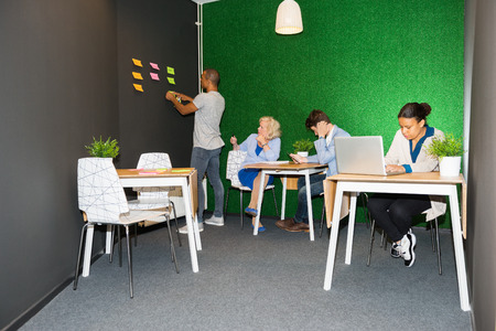 Creative business team writing on adhesive notes in office. Nice