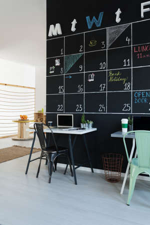 Simple trendy workspace next to blackboard calendar on wall
