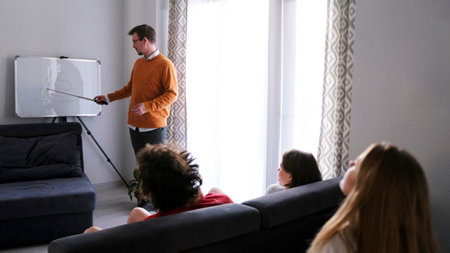 Rear view of a young teacher writing on a blackboard and teaching a math class during a virtual class