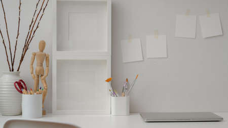 Close up view of minimal designer workspace with frames, painting tools, decorations and laptop on white table with sticky note on brick wall