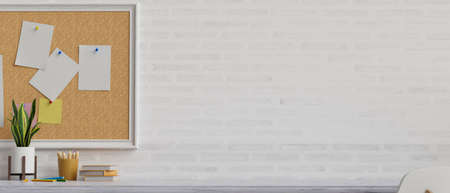 Minimal working space with notice board on the brick wall and stationery on the table, 3D rendering, 3D illustration
