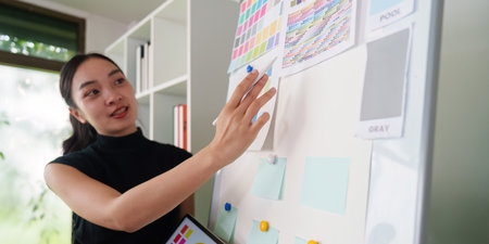 Professional attractive female leader sticks sticky note while presents creative marketing plan by using brainstorming mind mapping statistic graph at modern business meeting room. Immaculate.