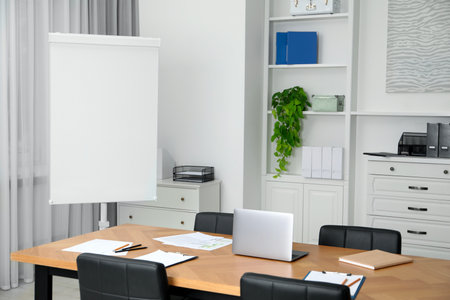 Flip chart, wooden table and chairs in conference room. Mockup for design