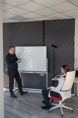 Two Caucasian men discussing work at a white board