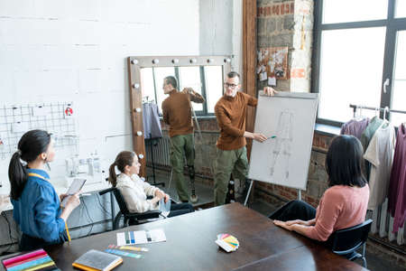Young disable male designer pointing at sketch on whiteboard while making presentation to colleagues